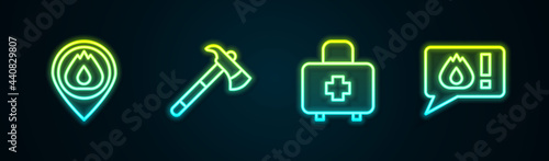 © Kostiantyn, Obraz premium Set line Location with fire flame, Firefighter axe, First aid kit and Telephone call 911. Glowing neon icon. Vector