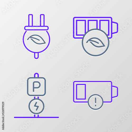 Obraz premium Set line Low battery, Charging parking electric car, Eco nature leaf and Electric saving plug icon. Vector