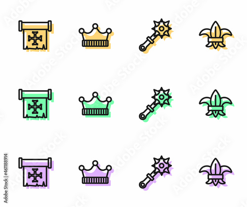 Obraz premium Set line Mace with spikes, Crusade, King crown and Fleur lys or lily flower icon. Vector