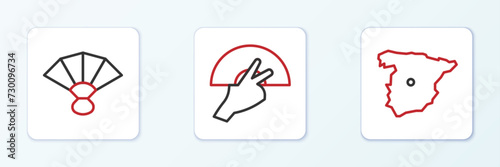 Obraz premium Set line Map of Spain, Fan flamenco and icon. Vector