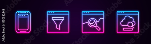 Fototapeta premium Set line Mobile phone, Browser window, Website with stocks market and Cloud technology data transfer. Glowing neon icon. Vector
