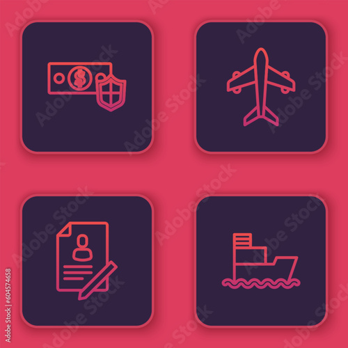 © Oksana, Fototapeta premium Set line Money with shield, Document, Plane and Ship. Blue square button. Vector