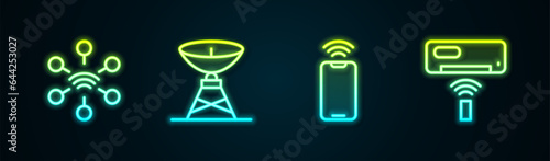 © Kostiantyn, Fototapeta premium Set line Network, Satellite dish, Mobile with wi-fi wireless and Air conditioner. Glowing neon icon. Vector