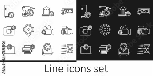 © vector_v, Naklejka premium Set line Old hourglass with sand, Video camera setting, Bank building, Setting, Photo, Refrigerator, and Drill machine icon. Vector