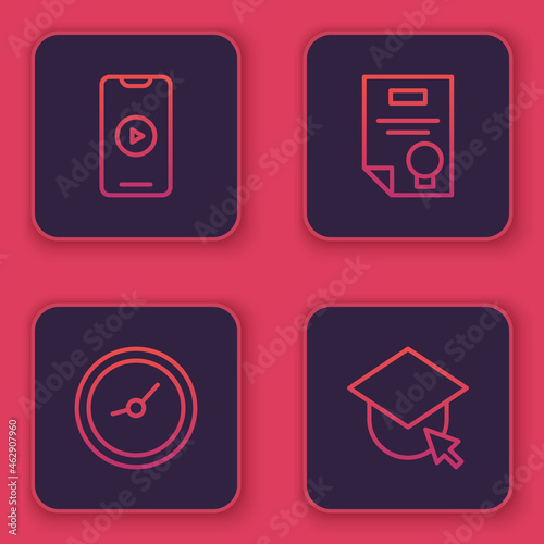 © Oksana, Fototapeta premium Set line Online play video, Clock, Certificate template and Graduation cap on globe. Blue square button. Vector