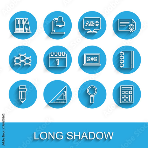 Obraz premium Set line Pencil with eraser, Triangular ruler, Office folders, Magnifying glass, Calculator, Calendar first september date, Spiral notebook and Chalkboard icon. Vector