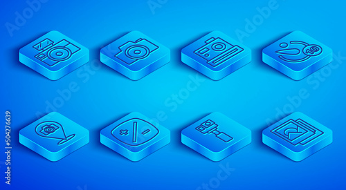 © Kostiantyn, Obraz premium Set line Photo camera with flash, Exposure compensation, Action, Camera timer, and frame icon. Vector