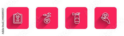 Obraz premium Set line Radiation warning document, Radioactive, Fire extinguisher and with long shadow. Red square button. Vector
