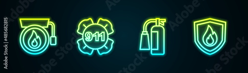 Obraz premium Set line Ringing alarm bell, Emergency call 911, Fire extinguisher and protection shield. Glowing neon icon. Vector