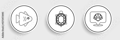 Fototapeta premium Set line Scallop sea shell, Fish and Turtle icon. Vector