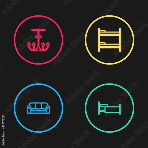 Fototapeta premium Set line Sofa, Bed, Bunk bed and Chandelier icon. Vector