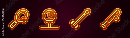 Obraz premium Set line Tennis racket with ball, Golf on tee, Medieval arrows and Baseball bat. Glowing neon icon. Vector