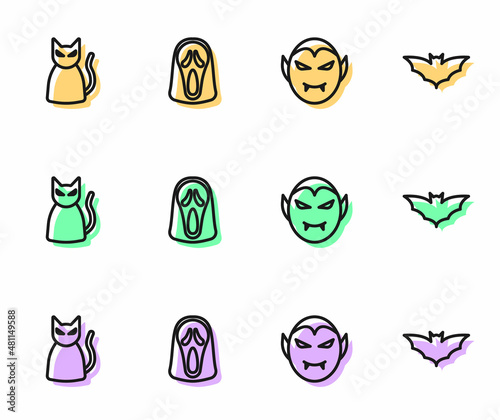 Fototapeta premium Set line Vampire, Black cat, Funny and scary ghost mask and Flying bat icon. Vector