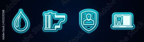 Obraz premium Set line Water drop, Camera film roll cartridge, User protection and Laptop with dental card. Glowing neon icon. Vector