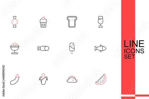 © Iryna, Fototapeta premium Set line Watermelon, Taco with tortilla, Corn, Eggplant, Fish, Ice cream, Salami sausage and in the bowl icon. Vector
