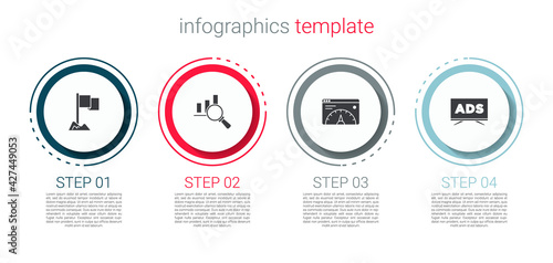 Naklejka premium Set Location marker, Magnifying glass and analysis, Website statistic and Advertising. Business infographic template. Vector