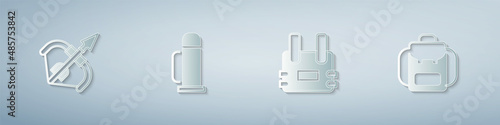 Obraz premium Set Medieval bow and arrow, Thermos container, Bulletproof vest and Hiking backpack. Paper art style. Vector