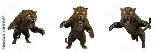 © Ibrar, Fototapeta premium Set of aggressive leopard predators with glowing orange eyes in pouncing and roaring poses isolated on white background.