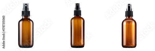 Obraz premium Set of amber spray bottles with black pumps, isolated on transparent background