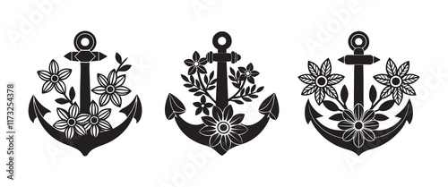 Fototapeta premium Set of Anchors silhouette, black and white silhouette, vector and illustration