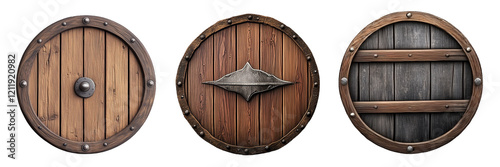 © Pixel Stock, Fototapeta premium Set of Ancient Wooden Round Shields Isolated on Transparent Background, Vintage Medieval Weaponry with Detailed Metal Reinforcements