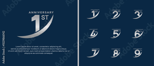 © dharmArt, Naklejka premium set of anniversary logo flat silver color on blue background for celebration moment