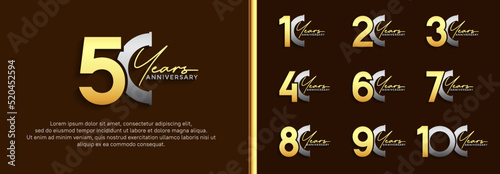 © dharmArt, Naklejka premium set of anniversary logo gold and silver color on brown background for celebration moment