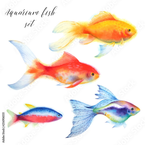 © Evgeniya, Fototapeta premium Set of aquarium fish. Goldfish, guppy, and cardinal tetra. Watercolor illustartion. Tropical sea wildlife.