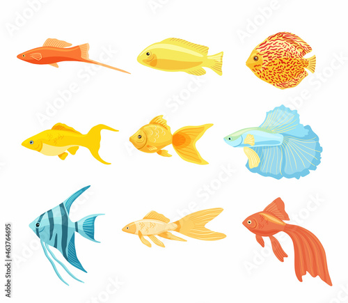 Naklejka premium Set of aquarium fishes clipart. Collection of beautiful unusual domestic fish. Vector illustration in cartoon style is isolated on white background