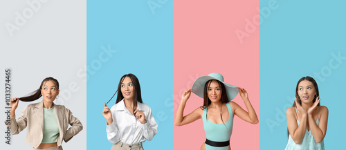 Naklejka premium Set of Asian woman with stylish mint makeup and clothes on color background