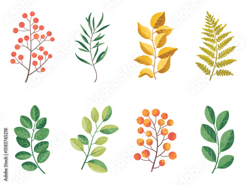 Naklejka premium Set of Autumn Foliage Branches with Red Berries and Leaves – Vector Collection of Botanical Design Elements in Flat Style for Seasonal and Floral Illustrations