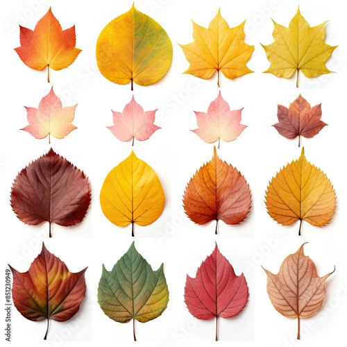 Fototapeta premium Set of autumn leaves on a white background of colors including yellow, orange, and brown leaves