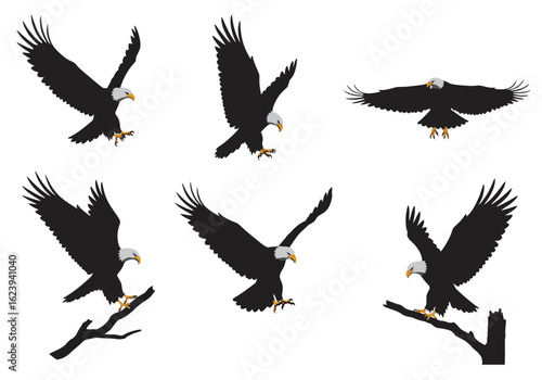 © Vector Horizons, Obraz premium Set of Bald Eagle Silhouettes in Flight and on Branches.