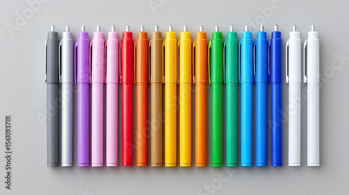 Obraz premium Set of ballpoint pens and markers lined in color order on plain desktop,...