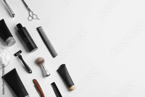 Naklejka premium Set of barber's equipment and men's cosmetic products on light background, top view. Space for design