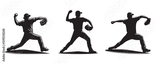 Obraz premium Set of Baseball Player throwing ball Silhouettes Vector Illustrations...