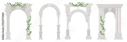 © MVshop, Fototapeta premium Set of beautiful arches with columns in cartoon style. Vector illustration architectural arches with Greek columns, patterns, green twisted ivy isolated on white background. Old antique columns.
