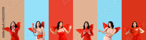 Obraz premium Set of beautiful young woman dressed as Cupid on color background. Valentine's Day celebration