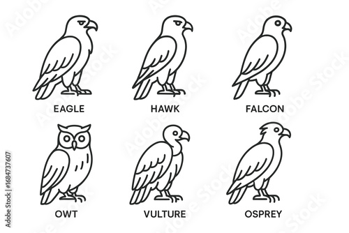 Obraz premium Set of bird line art illustrations: eagle, hawk, falcon, owl, vulture, osprey