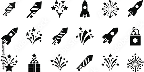 Naklejka premium Set of Black Firework, Rocket, and Celebration Solid Icons Vector Illustration