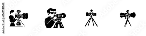 Obraz premium Set of black icons illustrating photographers using cameras on tripods