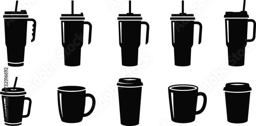 Fototapeta premium Set of Black Silhouette Travel Mugs and Cups Icons with Lids, Handles, Straws – Vector Drinkware Collection for Design Use