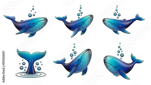© Alima.Std, Fototapeta premium Set of Blue 3D Whales Swimming and Splashing with Bubbles on Black Background
