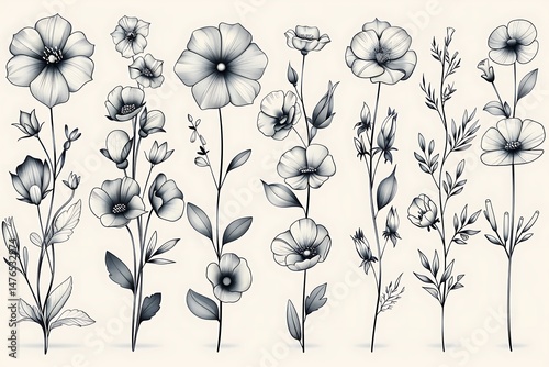 Obraz premium Set of botanical flower ink drawings high resolution picture