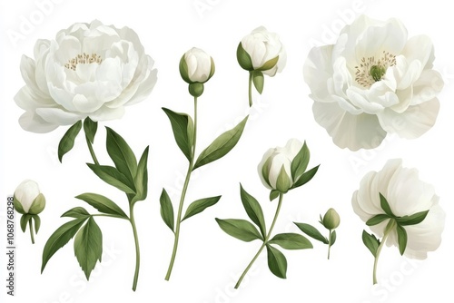 Obraz premium set of botanical watercolor white peony flowers and greenery for printing on...