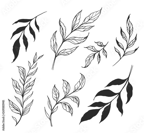 © aksol, Naklejka premium Set of branches with leaves. Hand drawn decorative elements. Vector outline