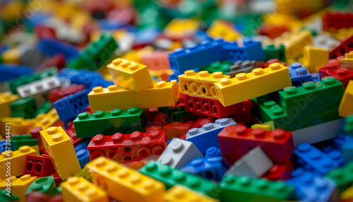 © annebel146, Fototapeta premium Set of brick block building toys 3d isometric illustration for children. Colorful bricks toy. Part and piece for decorative design and creative game. Copy space colorful background
