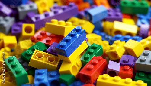© annebel146, Fototapeta premium Set of brick block building toys 3d isometric illustration for children. Colorful bricks toy. Part and piece for decorative design and creative game. Copy space colorful background