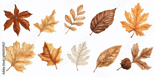 © Lilimanatasa, Fototapeta premium Set of brown and beige autumn leaves isolated on a white background