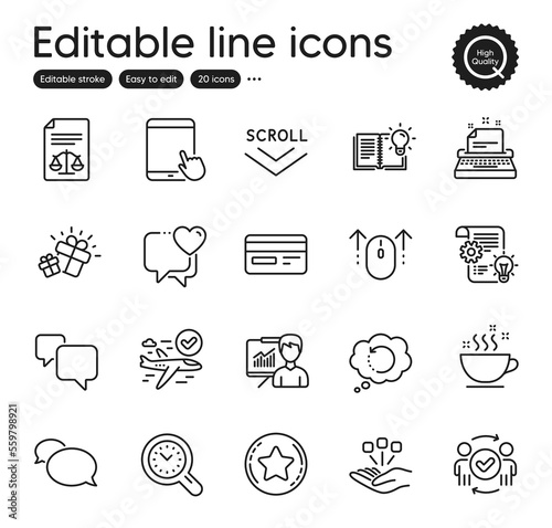 Fototapeta premium Set of Business outline icons. Contains icons as Credit card, Gift and Heart elements. Presentation, Cogwheel, Swipe up web signs. Scroll down, Typewriter, Tablet pc elements. Vector